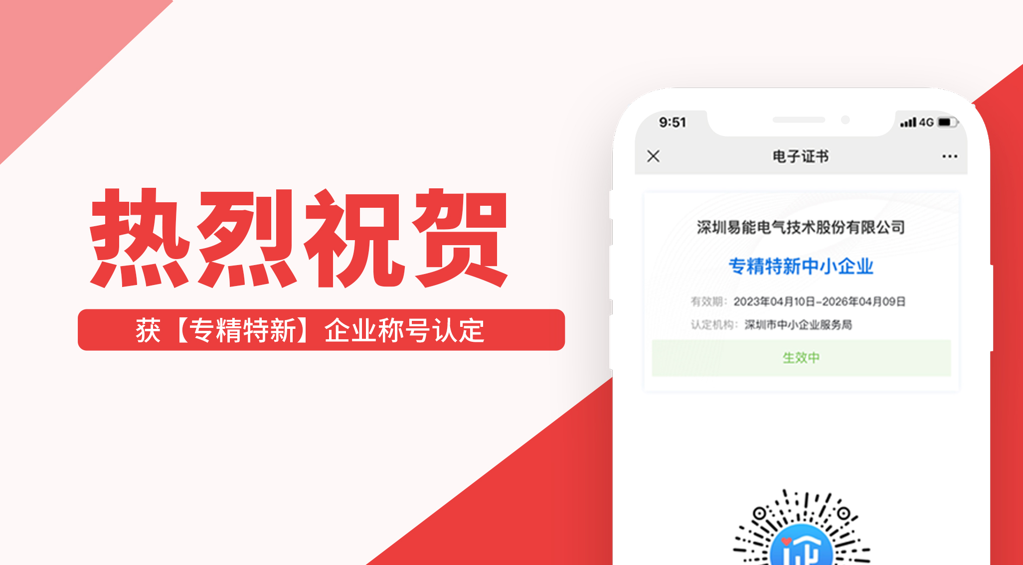 據(jù)深圳市“專(zhuān)精特新”中小企業(yè)名單公示,易能電氣憑借專(zhuān)業(yè)技術(shù)水平,創(chuàng)新能力等綜合實(shí)力成功獲評(píng)深圳市“專(zhuān)精特新”中小企業(yè)稱(chēng)號(hào)。