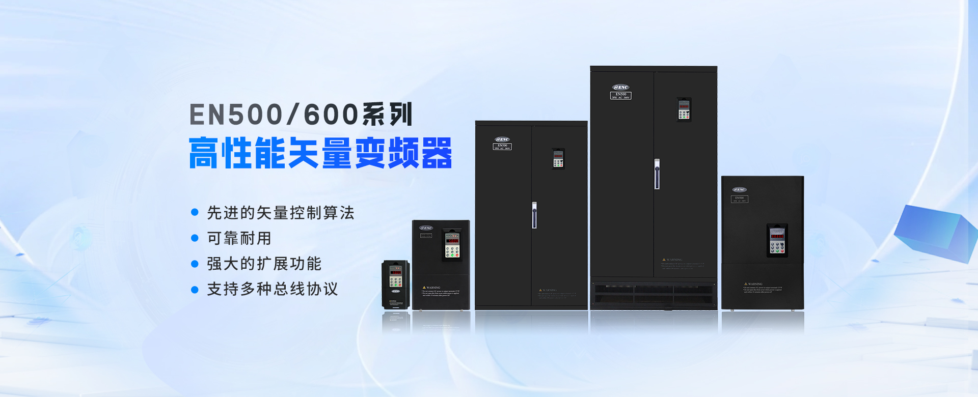 EN500/EN600系列高性能磁通矢量變頻器采用先進(jìn)的控制方式實(shí)現(xiàn)了高轉(zhuǎn)矩、高精度、寬調(diào)速驅(qū)動(dòng),可實(shí)現(xiàn)有PG矢量控制,無(wú)PG矢量控制,具有速度矢量和轉(zhuǎn)矩矢量?jī)煞N工作方式,能快速限住沖擊電流,廣泛用于高端制造業(yè)。該系列產(chǎn)品控制精度高、速度響應(yīng)快、低頻特性?xún)?yōu)越,智能檢測(cè)與保護(hù)完善,豐富的外圍總線(xiàn)擴(kuò)展、端子擴(kuò)展、繼電器擴(kuò)展、模擬量擴(kuò)展等。